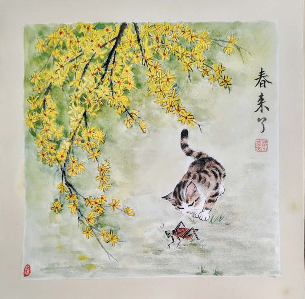 A festmény jobb oldalán olvasható a cím: „Itt a tavasz” (春来了) , bal alsó sarkában pedig egy piros színű pecsét, a „Sok szerencsét” (多福) felirattal, mely áldást és jókívánságot közvetít a mű szemlélője felé. A kiváló kínai női festő, Wan Yan (1972-ben született) több mint három évtizede él Magyarországon, munkásságán keresztül hidat teremtve a kínai festészet hagyományai és a magyar közönség között. Ez a mű is tökéletes példája annak, hogyan képes a hagyományos tusfestészet élővé válni a hétköznapi élet apró, mégis csodálatos pillanatainak megörökítésével.